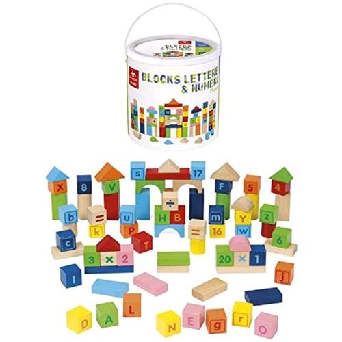 Blocchi in legno di varie forme, con lettere e numeri. Per imparare a costruire, comporre le prime parole e giocare con i calcoli aritmetici. 75 pezzi assortiti in legno Lettere e numeri da combinare per creare parole e operazioni Tante forme diverse per stimolare la manualit e la fantasia