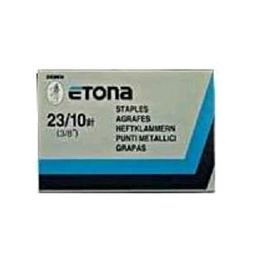 CONFEZIONE 10×1000 PUNTI ETO23/10 ACCIAIO.PUNTI METALLICI PER ALTI SPESSORI “ETONA”.CF10X1000 PUNTI “ETONA” ETO 23/10:CARATTERISTICHE:Lunghezza gambine: 10mm.N fogli cucibili: tra 50 e 70 fogli.Qualit filo: Acciaio.Punti per scatola: 1.000.