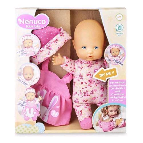 Bambola con vestito e cappello. Corpo morbido di 25 cm. Quando premi il suo ombelico, emette suoni diversi. possibile rimuovere la parte elettronica per lavarla. Raccomandato a partire da 1 anno; aiuta lo sviluppo affettivo ed emozionale e migliora la capacit manuale.