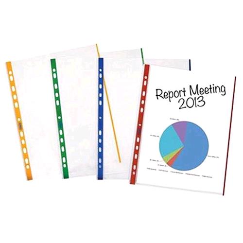 BUSTE A FORATURA CON BANDA COLORATA. Realizzate in polipropilene con finitura buccia d’arancia anti-rifleso. Banda di rinforzo e bordo colorati. Formato interno 21×29,7cm