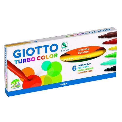 GIOTTO TURBO COLOR PENNARELLI LAVABILI ATOSSICI PUNTA FINE COLORI ASSORTITI CONF. 6 Pz. Pennarelli dotati di inchiostri innocui e lavabili, cappuccio ventilato e tappo di sicurezza. Punta fine antirientro diam 2,8mm. Pennino in fibra super-resistente di lunga durata.
