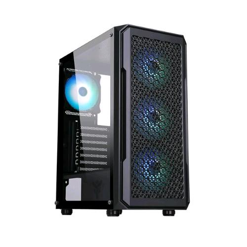 SIX TRAINGLE un case che unisce features di alto livello ad un estetica contemporanea. Dietro al frontale completamente traforato a trama esagonale, troviamo 3 delle 4 ventole ARGB da 12CM in dotazione (la quarta posta sul retro), tutte collegato al comodo controller interno e relativo telecomando. La struttura, di ultima generazione, permette di ospitare il meglio dellhardware sul mercato (visibile grazie alla paratia laterale in vetro), liquid cooling fino a 360mm, dissipatori alti fino a 160mm, schede video lunghe fino a 330mm e diverse ventole aggiuntive.. tutto molto pratico da assemblare grazie allottimo cable management da 22mm.
