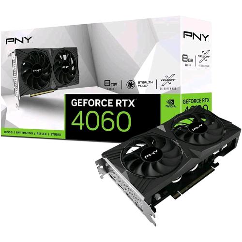 PNY GeForce RTX 4060 Ti Dual. Processore grafico / fornitore: NVIDIA, Processore grafico: GeForce RTX 4060 Ti, Frequenza del processore: 2310 MHz. Memoria Grafica Dedicata: 8 GB, Tipo memoria adattatore grafico: GDDR6, Ampiezza dati: 128 bit. Risoluzione massima: 7680 x 4320 Pixel. Tipo interfaccia: PCI Express 4.0. Tipo di raffreddamento: Attivo, Numero di ventole: 2 ventola(e)