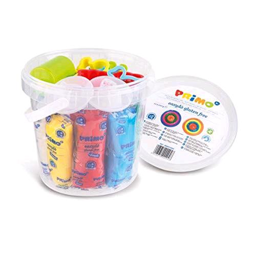 Plastilina morbida, 10 diversi colori (bianco, giallo, blu, viola, nero, arancione, rosso, rosa, verde, marrone), ogni 100 g per colore, 6 piccole forme (gufo, pesce, cane, gatto, farfalla, cane), 8 grandi forme (farfalla, orsetto, cane, trattore, uomini, uccelli, casa, anatra), 1 mattarello, in pratico secchio.