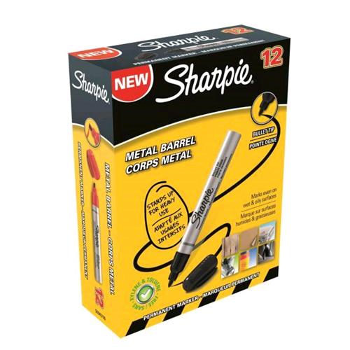 MARCATORI PERMANENTI. SHARPIE Metal Small. Marcatori ancora pi robusti!. Il fusto in alluminio leggero ideale per utilizzi intensivi. Cappuccio in plastica con clip: facile da mettere e togliere. Si pu lasciare senza cappuccio fino a 30 minuti. Punta resistente adatta per utilizzi intensi. Ottime performance di marcatura su quasi tutte le superfici. Scrive su quasi tutte le superfici, anche oleose o bagnate. Perfetto per scrivere su cartoncino, fotografie, superfici ondulate, legno, metallo, alluminio, pietra, plastica, pelle e altro ancora. Durata di scrittura fino a 695 metri* per il formato Small del marcatore a punta tonda. Punta resistente ideata per la scrittura su superfici abrasive. Scrive su legno, metallo, plastica, vetro e molto altro ancora. Formula di inchiostro specifica per superfici dure. Resistente all’acqua e allo scolorimento – Inchiostro a base di coloranti. Inchiostro a rapida essicazione / privo di Xylene & Toluene.