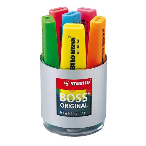 STABILO BOSS CILINDRO 6 COL.ASS. Pensato per tutti coloro che amano leggere e si concentrano sull’essenziale. Design classico e inconfodibile dal 1971, con tecnologia STABILO Anty-Dry-Out: resiste fino a 4 ore senza cappuccio. Doppia ampiezza di tratto 2 e 5 mm. Ricaricabile con inchiostro a base d’acqua ideale da usare su fogli, fotocopie e fax. Conf. Bicchiere con 6 evidenziatori.